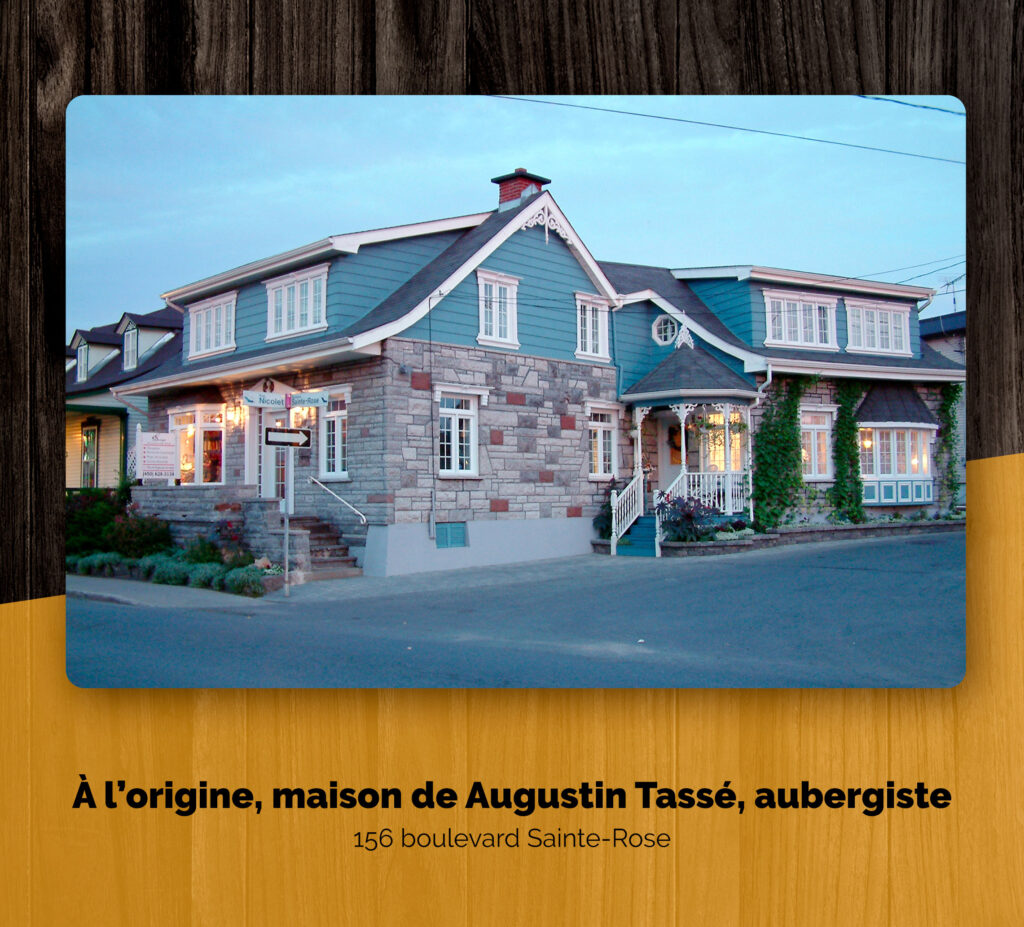 Propriétaire, Augustin Tassé exploitera son auberge, la fameuse Auberge Tassé située au coin nord-ouest du boulevard Sainte-Rose et de la rue des Patriotes, où il résidait avec sa famille, de 1827 à 1841, année où il vend la propriété à Pierre Labelle, cultivateur. N’ayant plus de résidence, le 15 mai 1841, il fait l’acquisition de l’emplacement juste en face où on retrouve aujourd’hui la maison portant le numéro civique 152-154 boulevard Sainte-Rose. Le 18 août 1848, il vendra cette maison à son beau-père Thadée Hotte et, le même jour, il passe le marché de construction avec Jean-Baptiste alias «Garçon» Joly pour cette nouvelle maison située aujourd’hui au 156 boulevard Sainte-Rose. Augustin décède en 1849 et la propriété de cette nouvelle maison passera aux mains de la famille de Sophie Hotte, sa veuve, jusqu’en 1855.